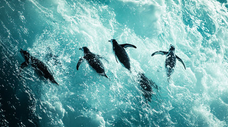 Gentoo penguin jumping out of the water with splashes