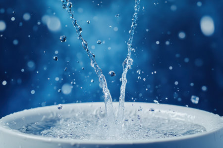 flow of water from water faucet with splashes on surface of blue plate