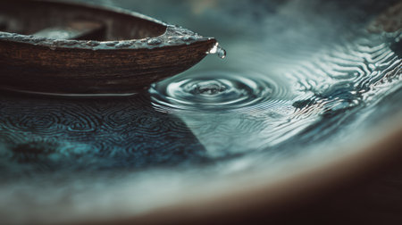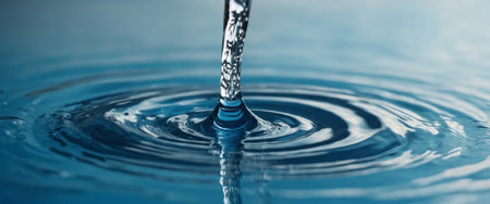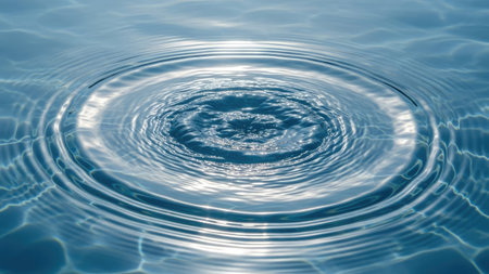 Gentle drop descendlets onto a tranquil blue liquid, sparking concentric waves that radiate outward, capturing a peaceful and hypnotic natural harmony.