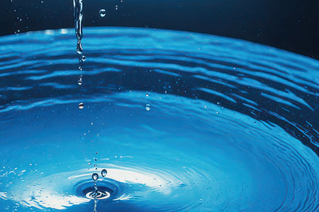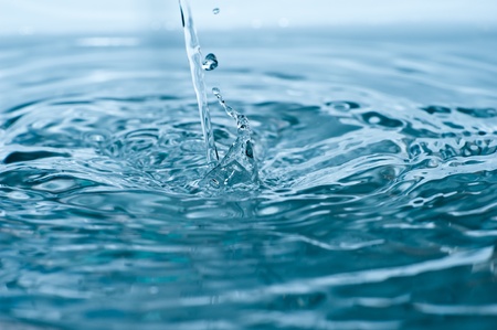 water stream with splash drops, blue background