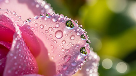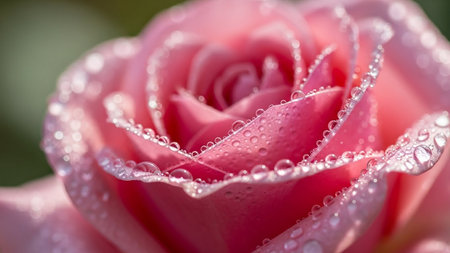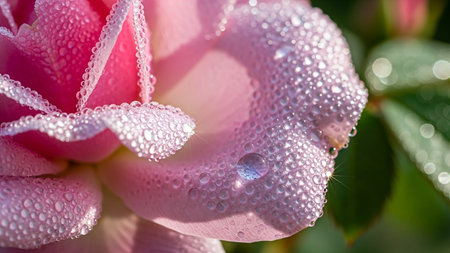 Macro view of a delicate pink rose with numerous clear dew drops clinging to its soft petals, illuminated by gentle sunlight.