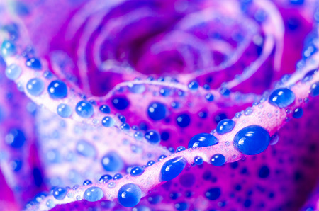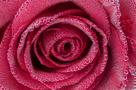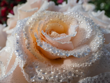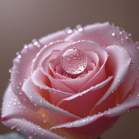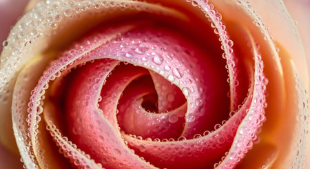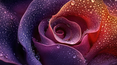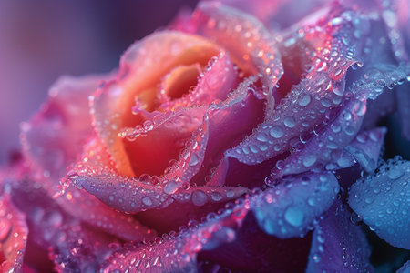 A detailed macro shot of a rose with dew drops, focusing on the intricate patterns and textures created by the water droplets.