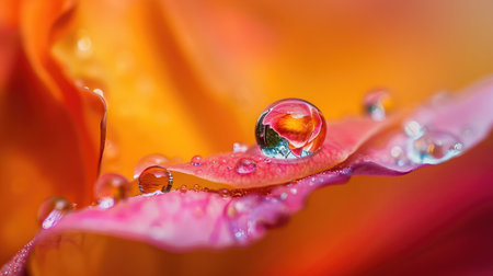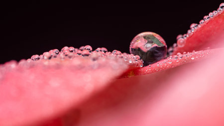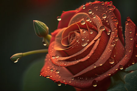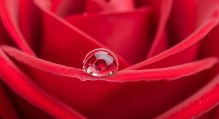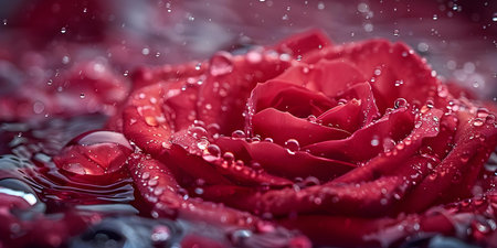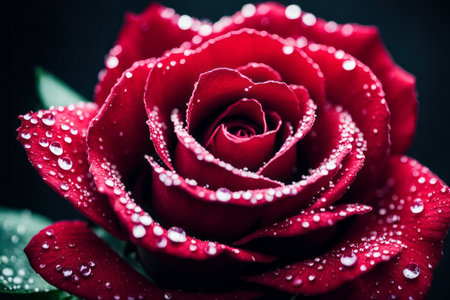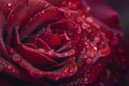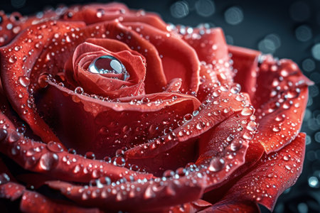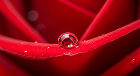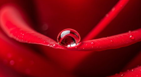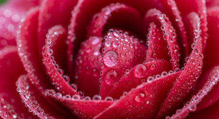 A closeup view captures the stunning beauty of nature in vibrant red rose petals, adorned with dew drops. This macro photography reveals the delicate and romantic side of botanical wonders