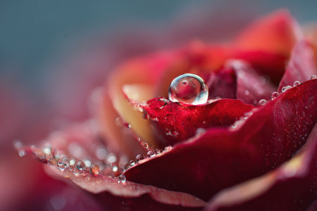 Close-up of dewdrop on a vibrant red rose petal, surrounded by tiny droplets. The soft focus reveals delicate textures and a rich blend of colors, enhancing the flower's natural beauty