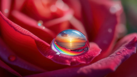 Close-up of a red rose petal with a water droplet reflecting a vibrant sunset and rainbow, symbolizing beauty and nature's harmony.
