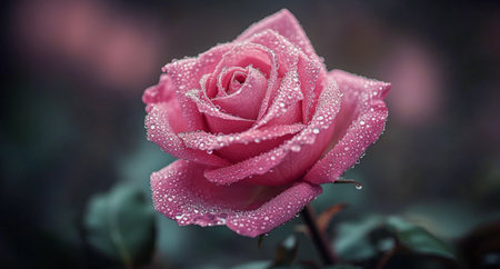 A stunning pink rose displays delicate petals adorned with shimmering water droplets.
