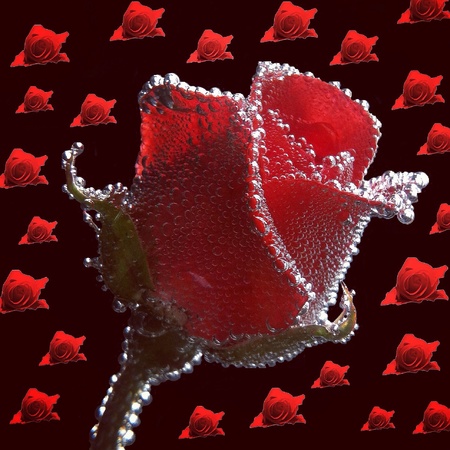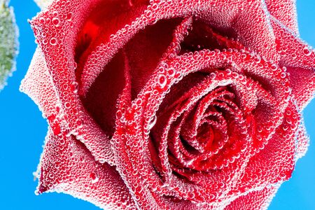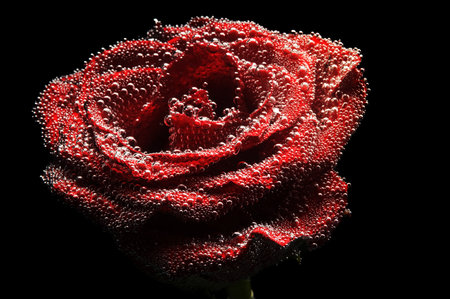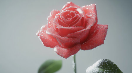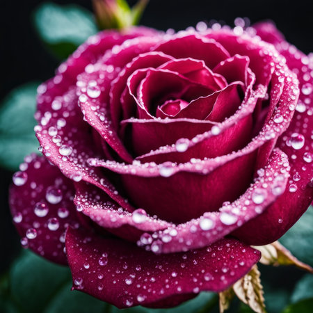 A beautiful closeup shot captures the details of a vibrant red rose covered in dew drops, highlighting its texture and color. Perfect for projects related to romance, nature, and flowers