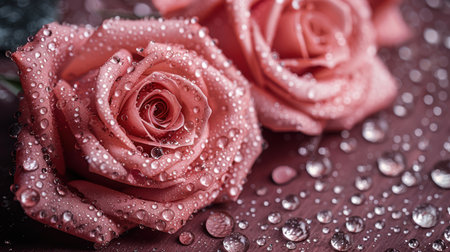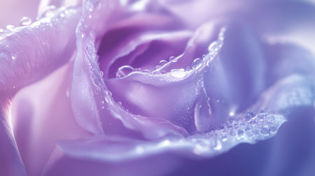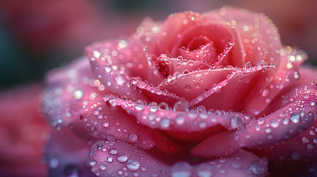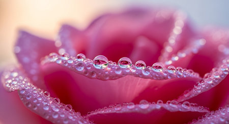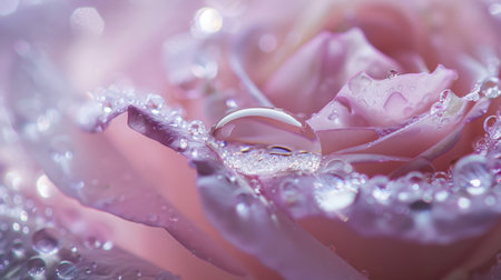 A stunning close-up image of rose petals adorned with glistening dew drops, set in soft lighting. This inviting floral scene evokes tranquility and natural beauty.