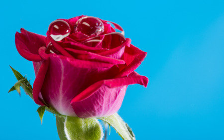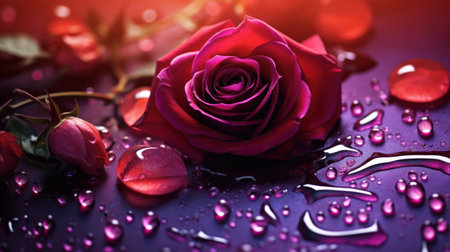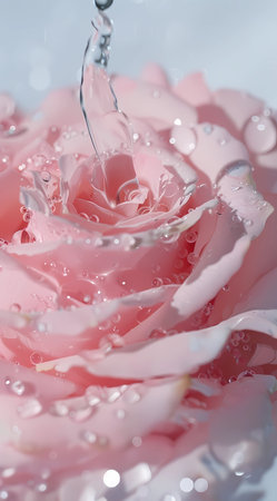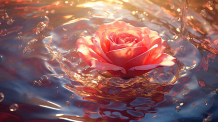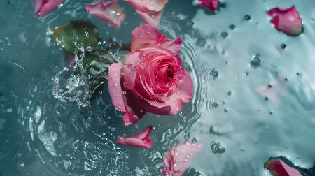 Dynamic Image of Water Droplets Falling on a Rose Capturing the Splash. Concept Water Droplets, Rose Petals, Dynamic Photography, Splash Effect, High-Speed Capture