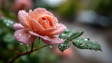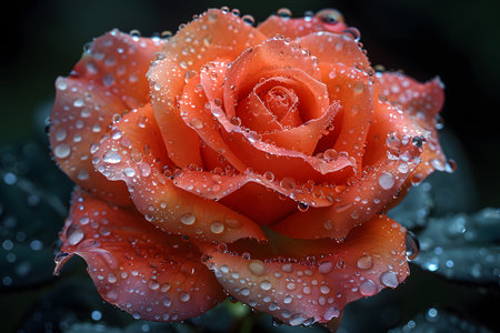 Macro shot of raindrops gathering on the surface of a coral rose, highlighting the vibrant color and delicate form
