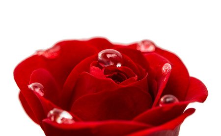 A classic red rose with dewdrops on its petals, isolated on a pale gray background.