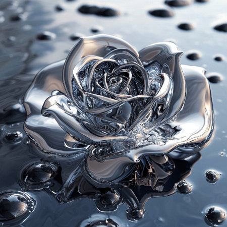 A captivating silver rose delicately rests on a metallic surface adorned with water droplets. Its intricate details exude elegance and sophistication, making it a perfect visual for artistic and romantic themes.