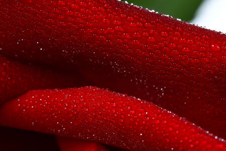 Delicate red rose petal with intricate natural texture and sparkling dew drops, showcasing the beauty of nature's finest details in macro photography.