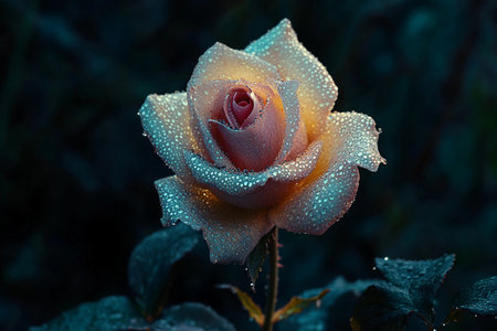 A stunning rose stands elegantly, graced by tiny dew drops that shimmer in the morning light. Nature's artistry captures the beauty of this flower, evoking a sense of serenity and freshness.