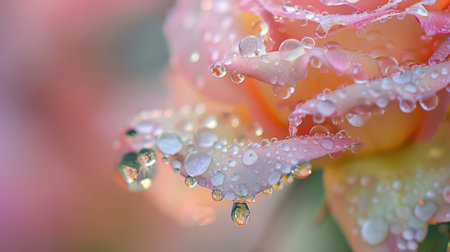 Water droplets clinging to the edges of a pastel rose, reflecting the soft hues of its petals in shimmering beauty