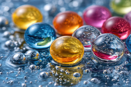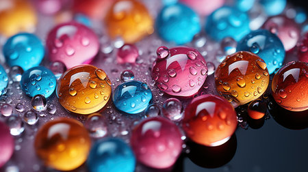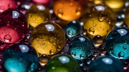Colorful glass or acrylic spheres on a wet surface with water droplets