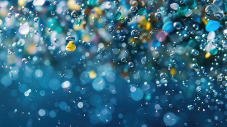 A mesmerizing sight of vibrant soap bubbles creating captivating light patterns on the tranquil surface of shimmering blue water, offering a serene and tranquil ambiance.