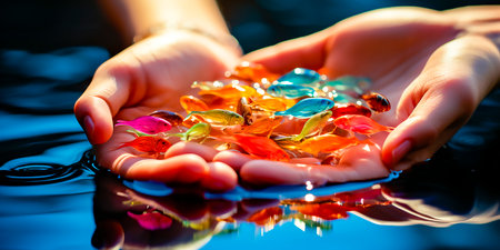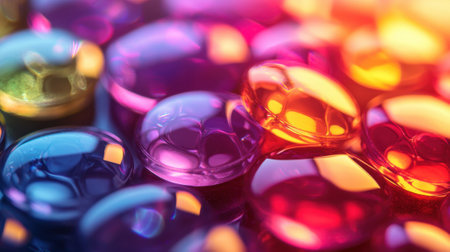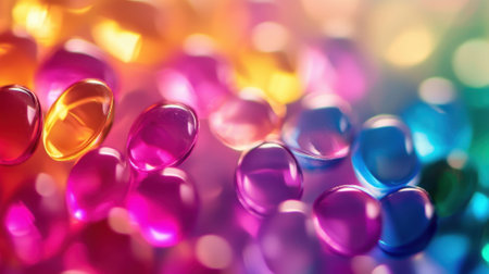 A colorful array of small, round, clear pills. The pills are of different colors and sizes, creating a vibrant and eye-catching display. Concept of energy and liveliness