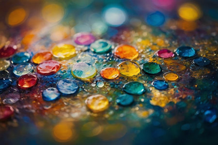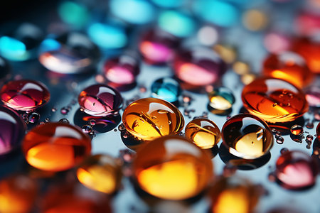 Vibrant water droplets rest on a surface, reflecting colorful lights in the background. This macro image captures beauty and artistry in texture and depth.