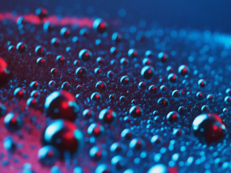 A striking macro captures numerous clear water droplets scattered across a smooth, vibrant blue surface. Each droplet acts like a tiny lens, reflecting light and the surrounding environment, creating miniature worlds within them. Some droplets reveal subtle, colorful refractions, adding a touch of unexpected vibrancy. The varying sizes and the precise focus on the spherical forms highlight the beauty of water in its purest state, showcasing its reflective and refractive properties in...