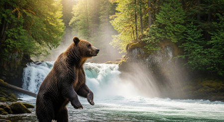AI Generated. Majestic Brown Bear Enjoying a Refreshing Water Spray in the Wilderness as Sunlight Shimmers Off Its Fur Creating a Powerful and Natural Scene of Wildlife