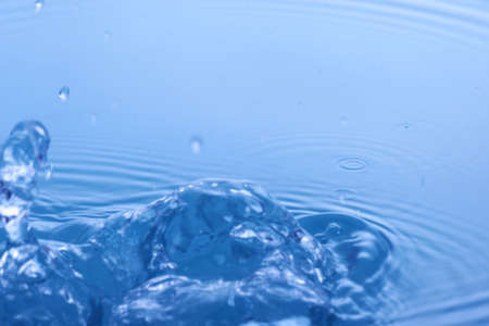 Water splash close-up macro photography. Blue water surface background.