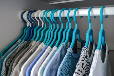 tidy organised wardrobe with matching flocked hangers and colour coded tops including shirts tees tank tops and sweater, organised home theme