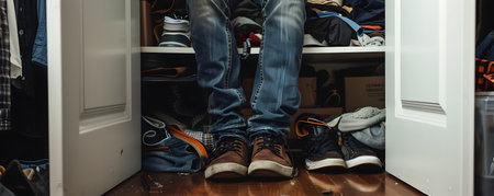 Man uses his foot to close a cluttered closet door concealing the mess and disorganization inside