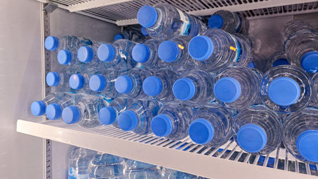 Rows of clear plastic water bottles with blue caps neatly arranged in a refrigerated display at a retail shop