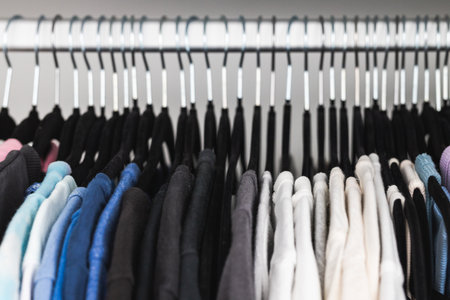 Assortment of monochrome t-shirts displayed on hangers in a retail store setting with focus on texture and fabric AI
