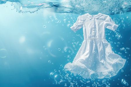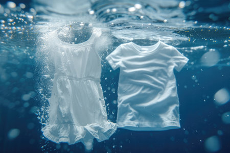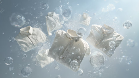 This image features white shirts suspended in water surrounded by bubbles, creating a sense of freshness and cleanliness ideal for laundry themes.