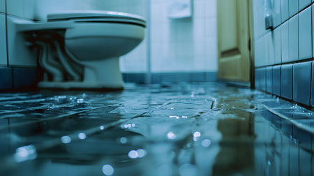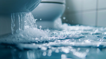 A close-up shot of a toilet overflowing, with water rushing out onto the bathroom floor, creating a miniature tidal wave.