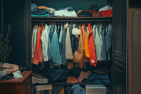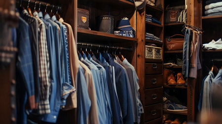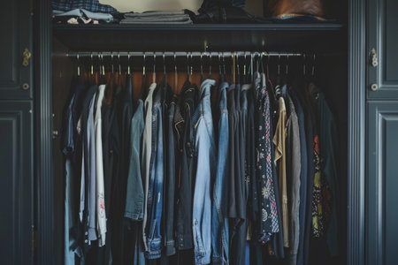 Stylish home wardrobe fashion aesthetic beauty thrifted clothing vintage modern luxury clothes garments room in apartment design lifestyle rack to choose dress hanging shirt pants jeans