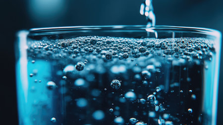 Crystal clear water poured into a glass, vibrant bubbles rising, against a dark background AI