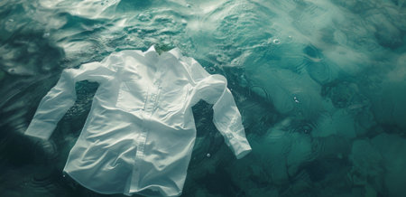 a white shirt floats gracefully on the calm surface of clear blue water, illuminated by soft light.