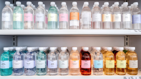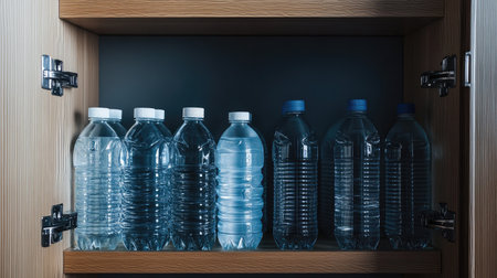 Top view of a half-open water cabinet, revealing assorted reusable water bottles in a minimalist setting.