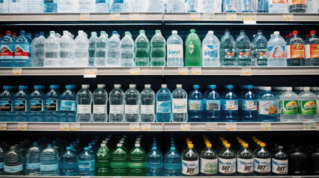 Group of plastic bottles with water.