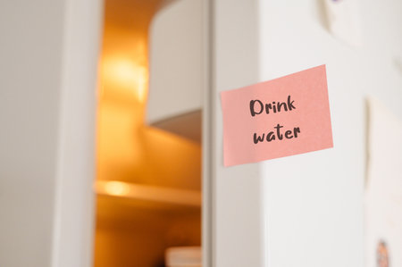 Drink Water reminder sticker prominently placed on a refrigerator