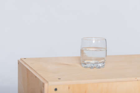 A glass of water with ice, on the wooden table.