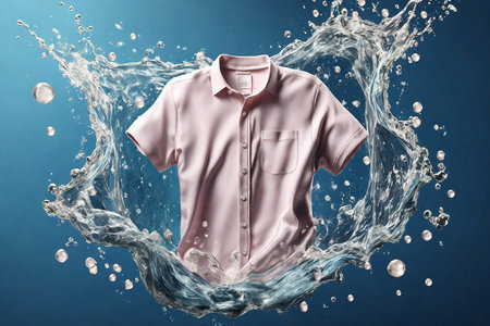 White shirt, water and laundry background for laundromat business, bleach product or fabric softener