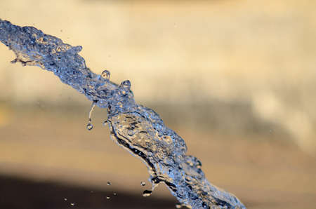 Water emerges from a pipe, creating a dynamic splash against a deep, dark backdrop. The composition highlights the flow and texture of the water. This image uses a shallow depth of field, with a focus on the water. It can be utilized for various commercial purposes, including illustrative and design applications.