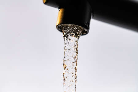 Water with bubbles flows down from the water tap against a black background