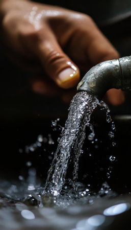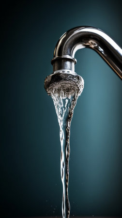Captivating close-up of water droplets splashing from a metal faucet, showcasing fluid dynamics. The calm surface captures reflections, creating a serene and refreshing ambiance.