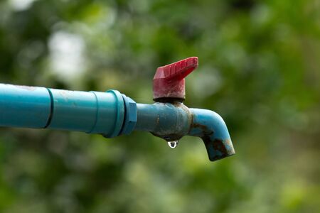 Old tap outdoors with the water drops