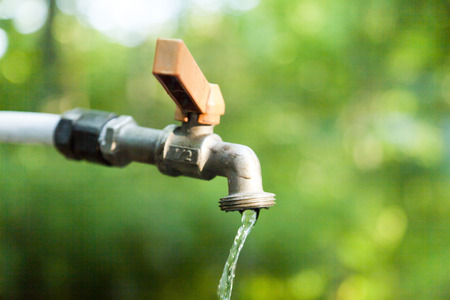The water tap is opened and water flows out of it in the background of nature