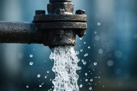 Close-up of dark fluid gushing from corroded metal pipes into a water body, symbolizing environmental impact.