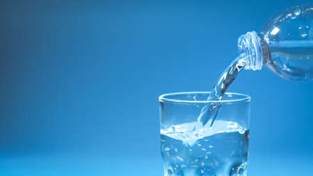 A glass with water in a blue colors background. Refreshment drinking water, dieting and health care beverage.