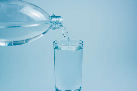 studio shot Clean drinking water poured into glass and natural blue background. healthy drinking water concept
