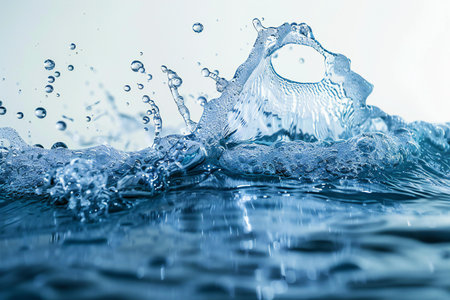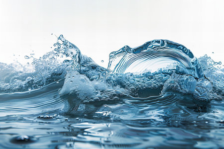 blue transparent water wave splash abstract with water bubbles on white background.