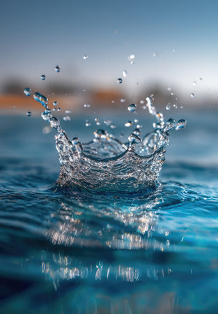 Vibrant water droplets ripple gently across tranquil blue fluid, forming intricate splash designs amid a softly blurred backdrop illuminated by gentle natural sunlig